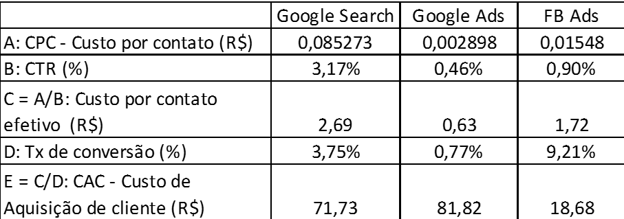 Para o CAC, o ideal é colocar todos os custos na cesta, como Propaganda, Equipe de Vendas, Flyers, Brindes, Feiras, etc., para que o custo fique o mais preciso possível. Se você trabalha com um produto digital, você pode incluir no custo o esforço realizado para a aquisição, por exemplo, e obter esse número a partir da quantidade de clientes obtidos pelo cadastro.